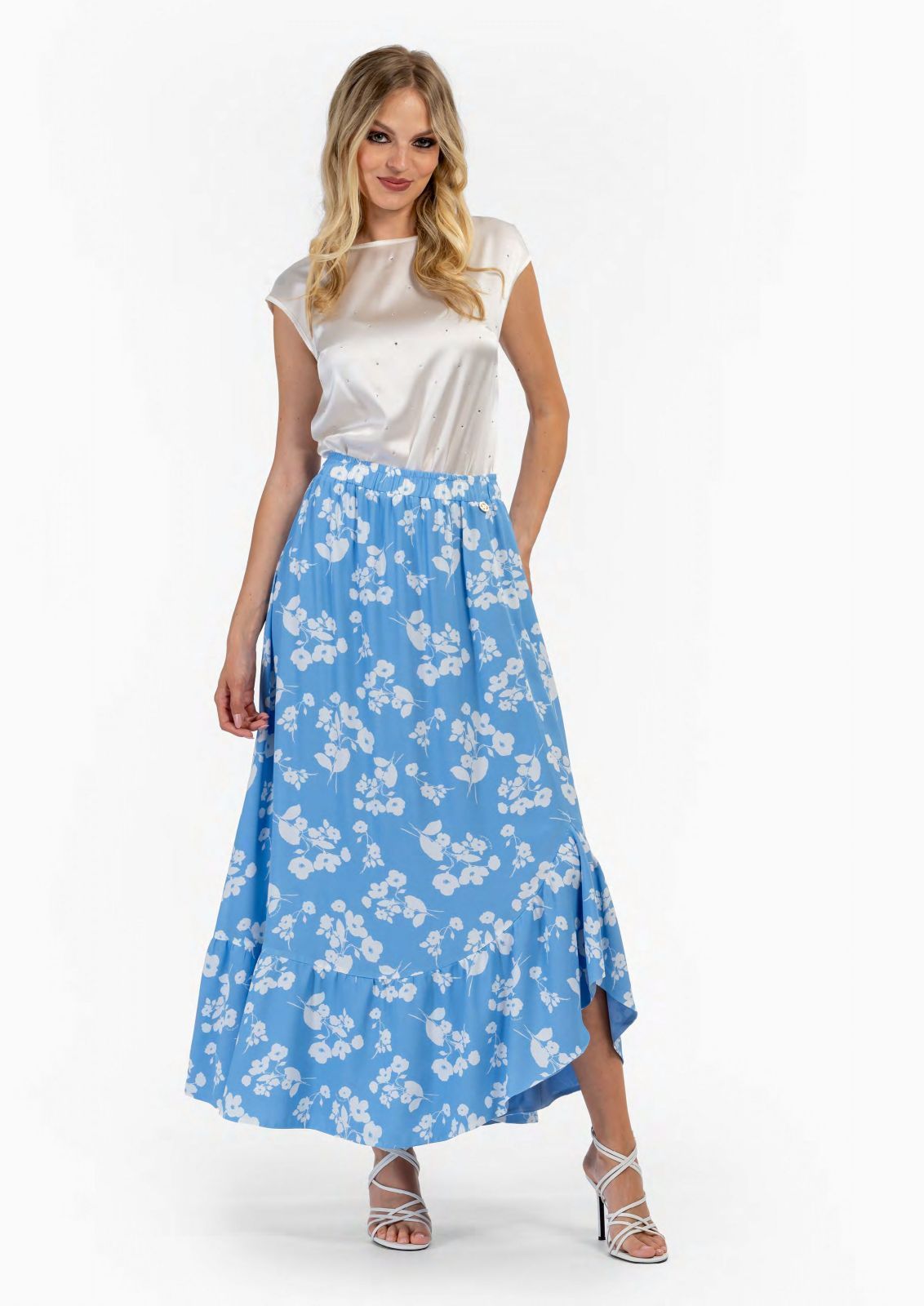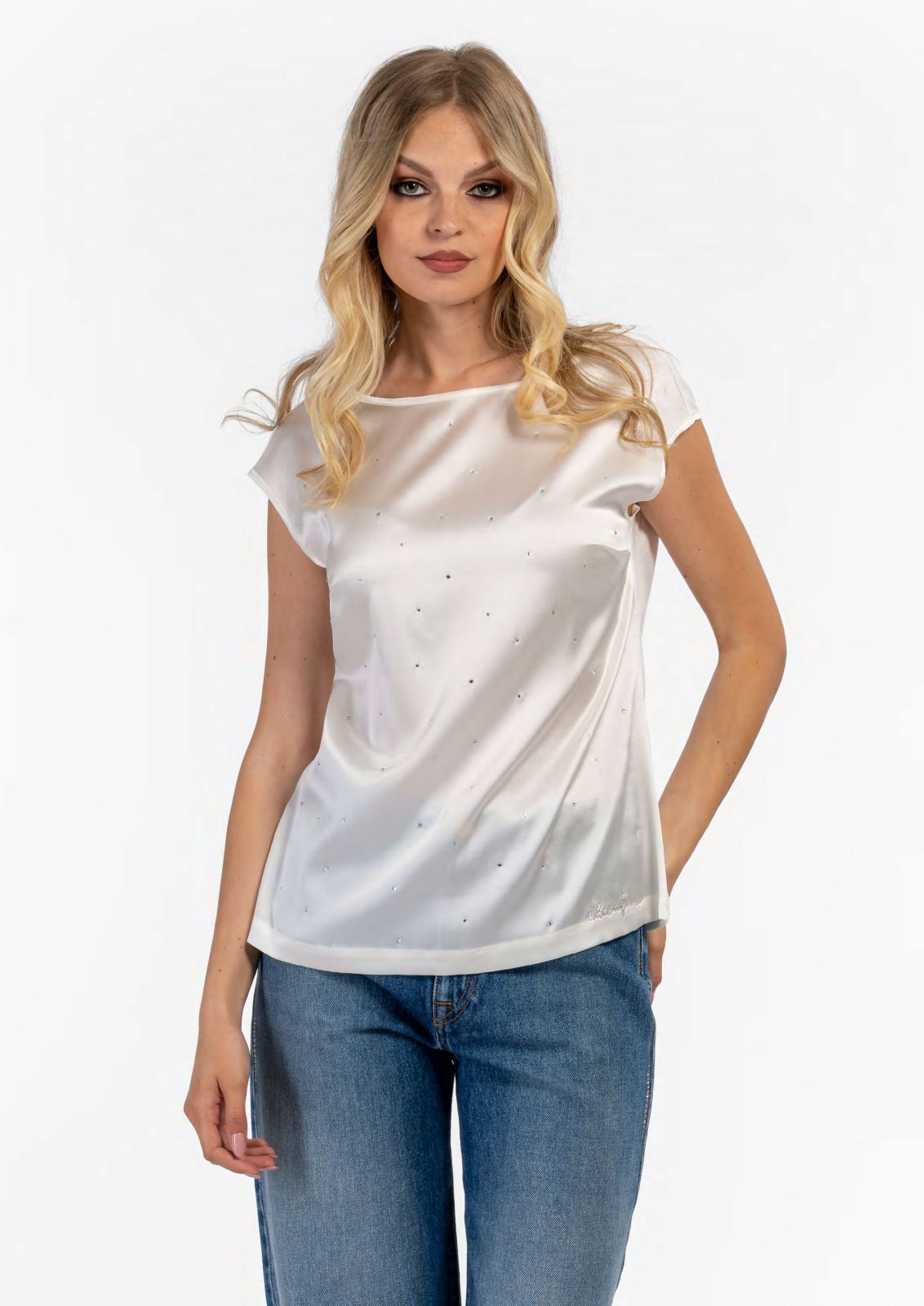 Блузка из вискозы-холодок украшена россыпью страз по передней части