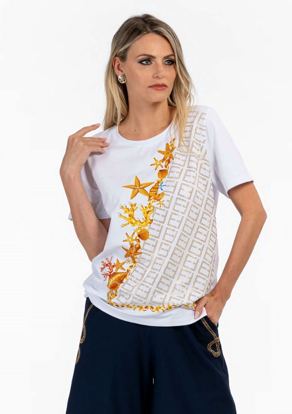 футболка из хлопка и лайкры с коротким рукавом, украшена принтом и стразами 1M118