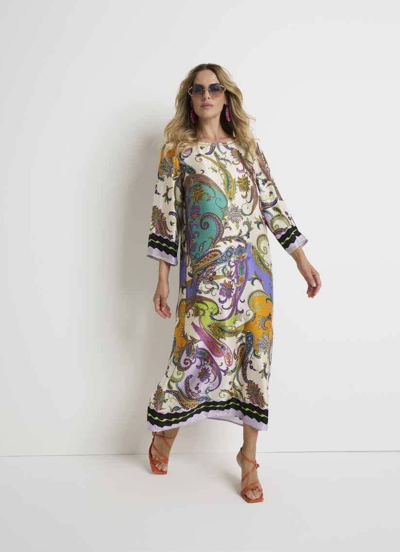 Платье прямого кроя из натуральной вискозы,стразы из трех нитий по горловине и рукаву, рукав семь восьмых, длина 137 см2E15